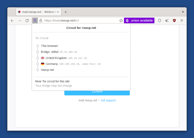 For example, here is how the browser looks when we try to log in to an email account at riseup.net, using their webmail interface: