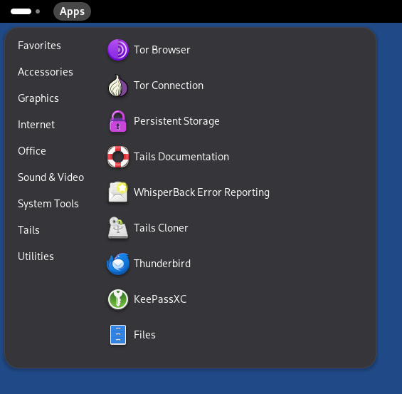 The Apps menu provides launchers for the included software and GNOME utilities.