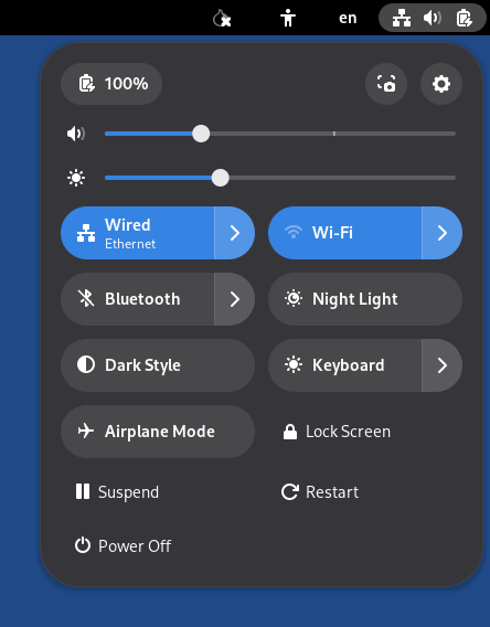 A l'extrem superior dret de la barra de navegació superior, el menú del sistema us permet gestionar la vostra configuració, connectar-vos a una xarxa Wi-Fi i reiniciar l'ordinador.